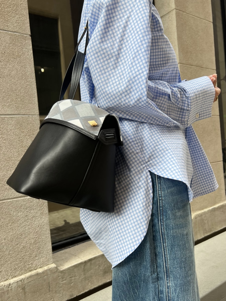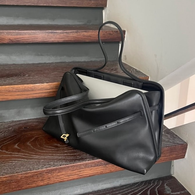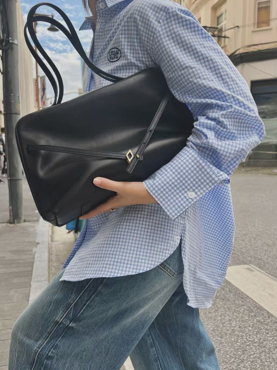 The folding edge is inspired from a working suit cuff, to extend the bagfrom busket to a hobo shape. Two sided alternertively to use the bag,plus the “8”shape bottom, are helping to carry variety stuffs, even fora one night out using.